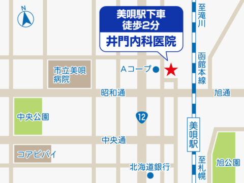 医療法人社団 井門内科医院内科・循環器内科 診療時間月火水木金土日 午前8:00~12:00●●●●●●/午後1:30~5:00●/●/●// (月曜〜土曜)毎朝8時より診察を開始いたします。 火曜午後、木曜午後、土曜午後、日・祝日は休診となります。 〒072-0002北海道美唄市東一条北1-2-8 TEL.0126-63-4535 アクセス JR函館本線「美唄駅」より徒歩2分 駐車場 13台